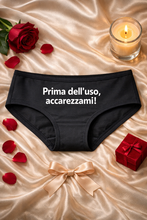 Una frase maliziosa e irresistibile che fa sorridere e lancia il messaggio senza imbarazzi: con queste slip nere e la scritta “Prima dell’uso, accarezzami!” l’atmosfera diventa subito più giocosa.