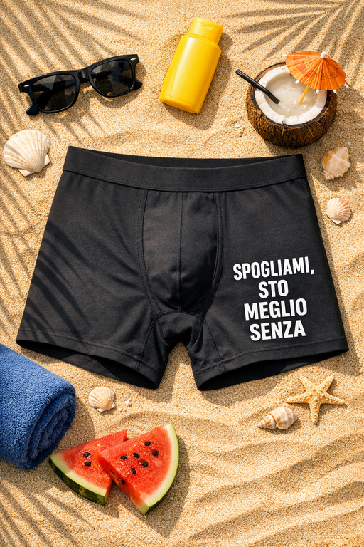 Non sono solo boxer: sono un messaggio. Il lettering bianco sulla gamba destra con SPOGLIAMI, STO MEGLIO SENZA è quella provocazione divertente che accende l’atmosfera e fa ridere al momento giusto.