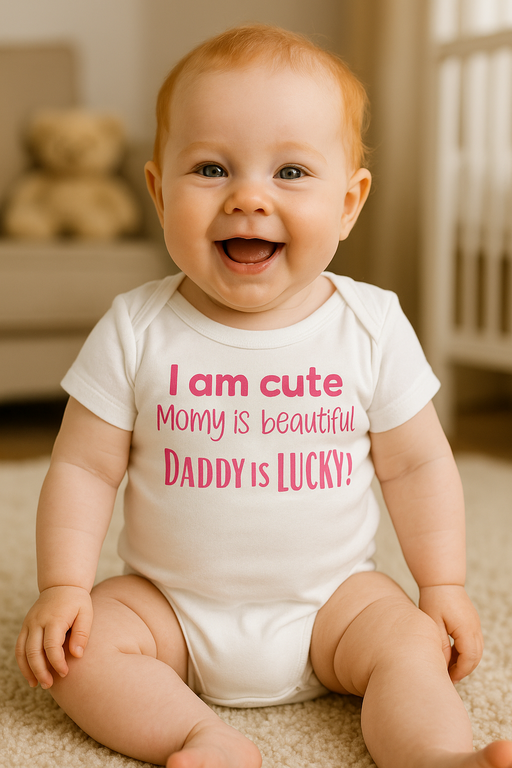 😎 Quando il bebè dice la verità: “I am cute Momy is beautiful DADDY is LUCKY!” — e lo fa con stile! Questo body bianco spiritoso alza l’umore a ogni cambio pannolino e a ogni visita.