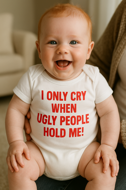 😂 Body che lo dice chiaro e tondo: “I ONLY CRY WHEN UGLY PEOPLE HOLD ME!” — e tutti capiscono subito quando è il momento di restituire il bebè alla mamma.