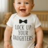 Il body bianco con scritta rossa e grafica della sveglia è un comico promemoria di chi guida il turno del mattino in casa. Perfetto per foto, visite e tutti quei momenti in cui la risata è la migliore strategia contro le notti insonni.