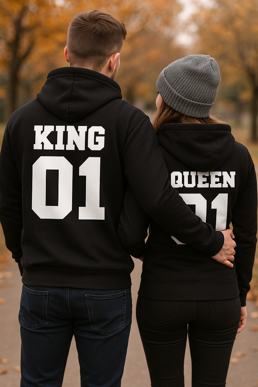 👑❤️ Ora si riconoscono re e regina… di schiena! Due felpe con cappuccio nere con lo slogan KING 01 e QUEEN 01 portano il vostro abbinamento a un livello regale. Quando vi girate, anche i vicini capiscono di chi è il telecomando e chi sceglie le pizze. Perfette per coppie con una scintilla di ironia e tanta, tanta love.