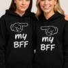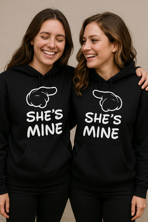 👉 Amore a prima vista… e al primo dito puntato: SHE’S MINE! Due felpe nere con cappuccio e l’iconica mano indicante dicono tutto prima ancora che qualcuno chieda: “State insieme?”