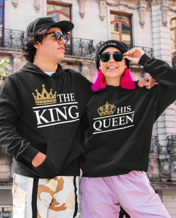 👑 Re e regina on tour: THE KING / HIS QUEEN su felpe con cappuccio nere con tasche frontali – incoronate l’amore con un tocco dorato!
