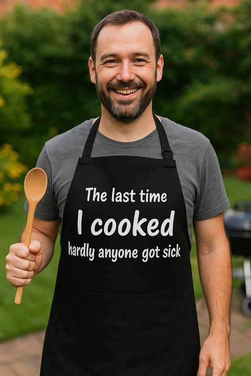 🤭 Quando il coraggio ai fornelli supera la ricetta: “The last time I cooked hardly anyone got sick” su un grembiule che dice la verità al posto delle scuse!