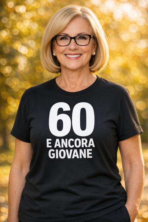 Perché a 60 anni puoi essere ancora più brillante di prima: la scritta 60 E ANCORA GIOVANE strappa sorrisi, attira complimenti e celebra l’età con sicurezza e autoironia.