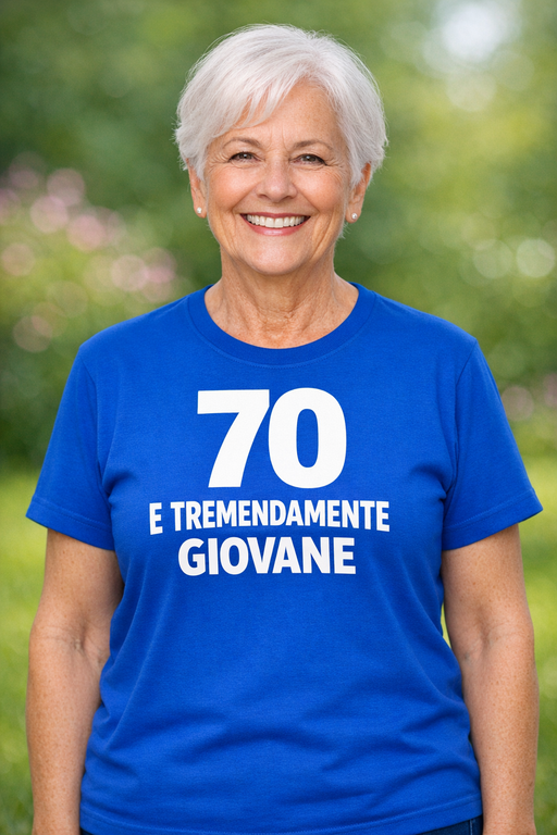 L’età è solo un numero: il carattere resta! La scritta 70 E TREMENDAMENTE GIOVANE parla chiaro e strappa sorrisi, perché la giovinezza è uno stato d’animo.