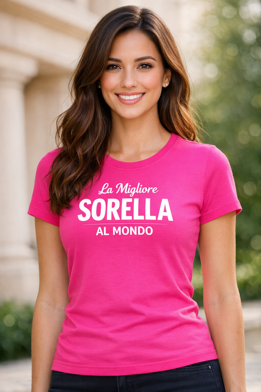 Rosa acceso, stampa bianca e un messaggio che parla chiaro: La Migliore SORELLA AL MONDO. Un capo semplice ma d’impatto, perfetto per celebrare chi salva le giornate, custodisce segreti e distribuisce abbracci da campionessa.