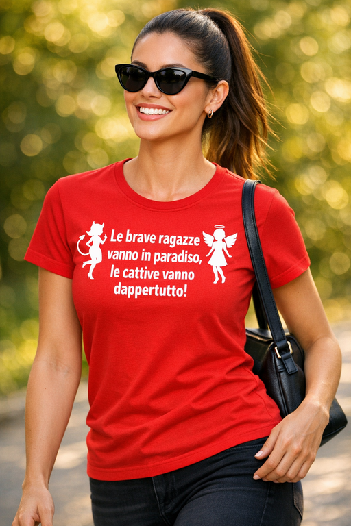 Il paradiso è bello… ma le cattive hanno il pass VIP ovunque! Una t-shirt rossa da donna con stampa bianca e iconette angioletto/diavoletto: ironica, audace e impossibile da ignorare, dall’aperitivo al party.