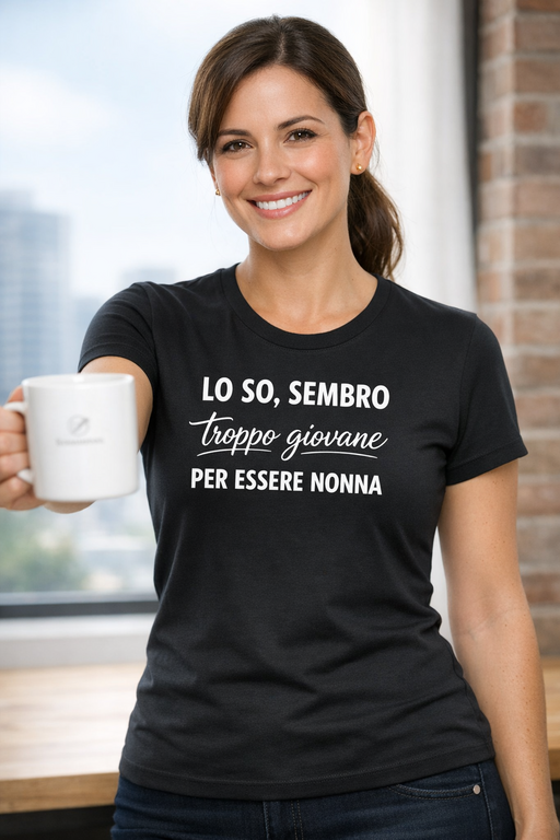 Una frase che dice tutto con stile: “LO SO, SEMBRO TROPPO GIOVANE PER ESSERE NONNA”. Il contrasto bianco su nero è super d’impatto e trasforma ogni uscita in un momento divertente (e pieno di complimenti).
