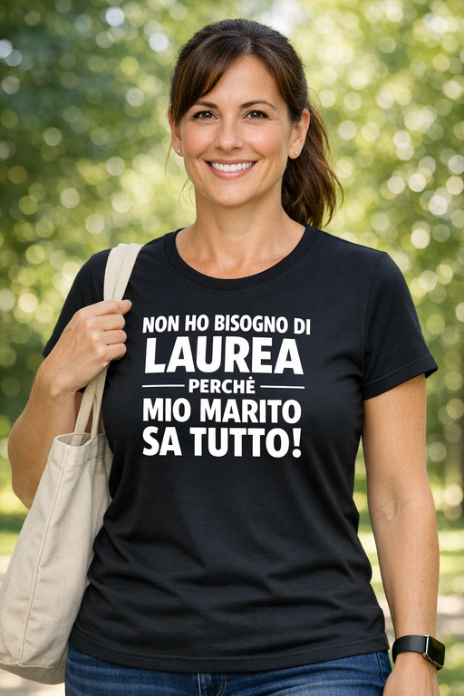 “NON HO BISOGNO DI LAUREA PERCHÉ MIO MARITO SA TUTTO!” Una frase che parla da sola: ironica, diretta e perfetta per strappare un sorriso ovunque, dal divano al pranzo in famiglia.