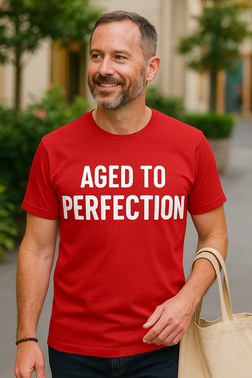 L’età è solo un numero, la perfezione è una maglietta rossa! 😎 La scritta AGED TO PERFECTION dice che con gli anni migliori sempre di più. Regalo top per compleanni e vere leggende! 🎉