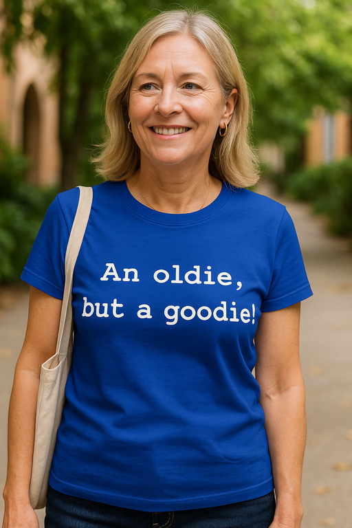 Le vecchie buone battute non passano mai di moda! 😎 Questa maglietta blu con la scritta ‘An oldie, but a goodie!’ dice che sei come il vino: migliori con gli anni. Perfetta per compleanni, feste retrò e per tutte le leggende della tua crew. 🎉