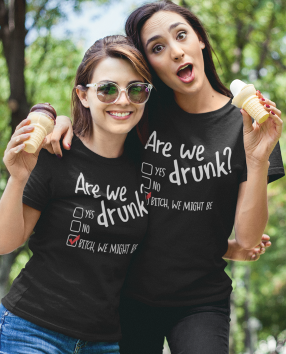 Quando la domanda della serata è fin troppo ovvia, lascia rispondere la tua maglietta! 🍻 Slogan “Are we drunk? ☐ yes ☐ no ☑ BITCH, WE MIGHT BE” che farà ridere tutti. Perfetta per feste, compleanni e coppie dal senso dell’umorismo audace! 🎉