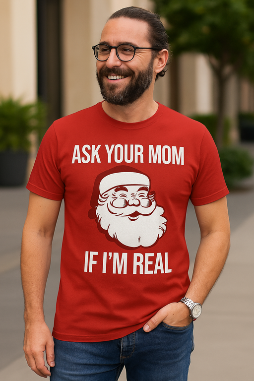 🎅 Ho-ho-ho… realta? ASK YOUR MOM IF I’M REAL! La maglietta rossa a maniche corte con un Babbo Natale sorridente e una vera provocazione natalizia: lascia che sia la mamma a decretare chi e la leggenda! Con questa maglia, ogni scena natalizia sara piu rossa, piu rumorosa e indecentemente piu divertente.