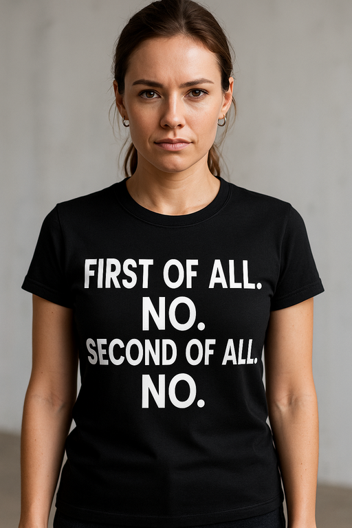 🙅 Quando la risposta è breve e due volte chiara: “FIRST OF ALL. NO. SECOND OF ALL. NO.” Questa maglietta nera con audace scritta bianca dice quello che la tua faccia pensa tutto il giorno. Ideale per lavoro, università o divano – il tuo “no” si vedrà già sulla porta. Meno spiegazioni, più pace e un sacco di risate.