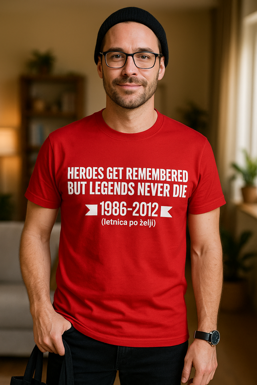 🦸♂️ Le leggende non muoiono, si mettono la divisa rossa: la maglietta con stampa HEROES GET REMEMBERED BUT LEGENDS NEVER DIE 1986–2012 (anno a scelta)!