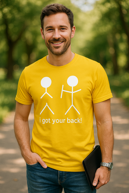🤣 Maglietta che, con un sorriso, dice: i got your back! (e lo intende alla lettera). Due figurine a stecchino bianche: una senza schiena, l’altra che la regge con orgoglio. Risultato? Risate, high-five e chiacchiere immediate ovunque tu vada.