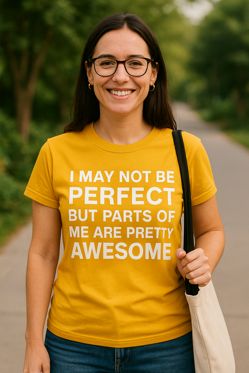😜 La perfezione la lasciamo agli altri, l’awesome ce l’abbiamo noi — e questa maglietta giallo senape lo dice forte e chiaro con ‘I MAY NOT BE PERFECT BUT PARTS OF ME ARE PRETTY AWESOME’.