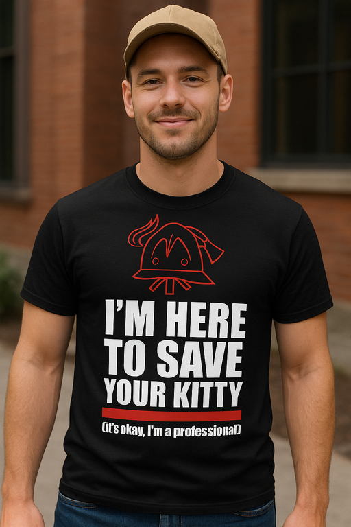 🚒😺 La scritta I’M HERE TO SAVE YOUR KITTY (it’s okay, I’m a professional!) + maglietta nera = risate e applausi immediati! Per tutti gli eroi che salvano gatti, vicini e il cattivo umore.