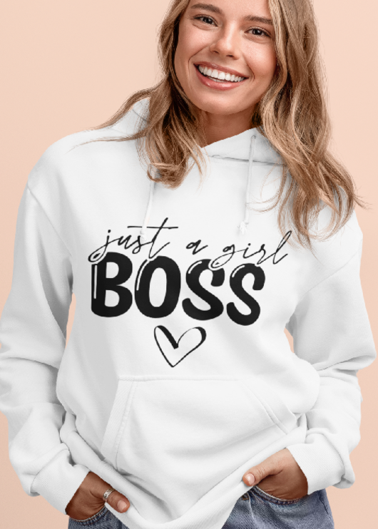 👑 Quando sei just a girl, ma in realtà sei il BOSS — ora anche su una felpa bianca con cappuccio e cuoricino!