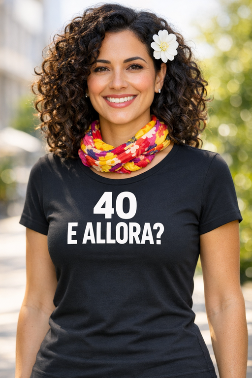 40? E ALLORA? Una t-shirt nera che parla al posto tuo e scatena risate. Perfetta come regalo per chi festeggia i 40 con stile e ironia.