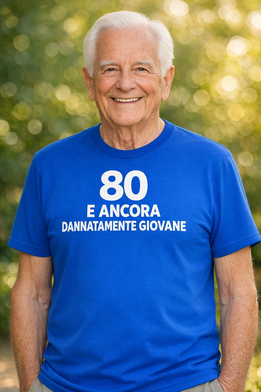 80 candeline? Spegnile con stile. Questa maglietta blu con la scritta “80 E ANCORA DANNATAMENTE GIOVANE” è perfetta per chi non ha alcuna intenzione di rallentare.