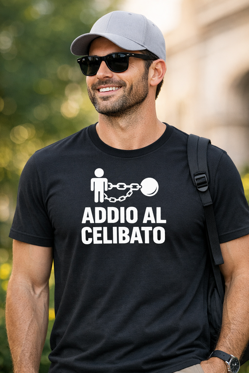 Sorrisi assicurati: la grafica con palla e catena e la scritta ADDIO AL CELIBATO dicono tutto senza bisogno di discorsi. È la “divisa” ideale per far capire subito che stasera si festeggia sul serio.