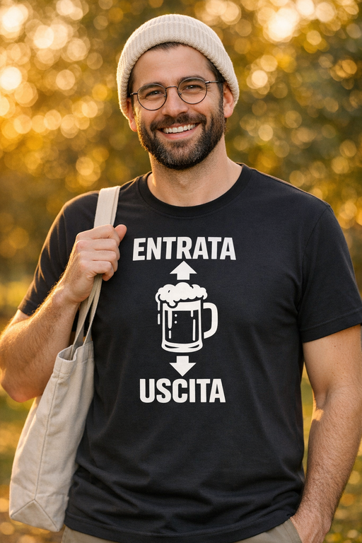 Grafica chiara e irresistibile: il boccale al centro e le frecce ENTRATA/USCITA raccontano il “percorso della birra” senza bisogno di spiegazioni, e diventano subito un argomento di conversazione.