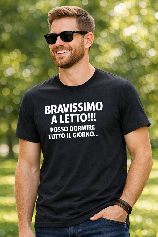 Una frase a doppio senso che fa sorridere al primo sguardo: “BRAVISSIMO A LETTO!!! POSSO DORMIRE TUTTO IL GIORNO…”. Perfetta per chi prende il riposo molto sul serio e vuole dirlo con stile.
