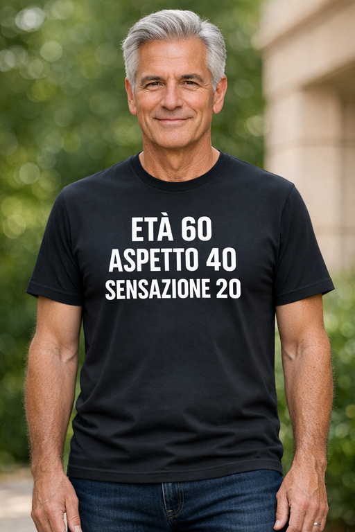 Età 60, aspetto 40, mi sento 20: una battuta pronta che fa sorridere e rende ogni foto ancora più memorabile. Ideale per chi resta giovane dentro e lo dice senza troppi giri di parole.