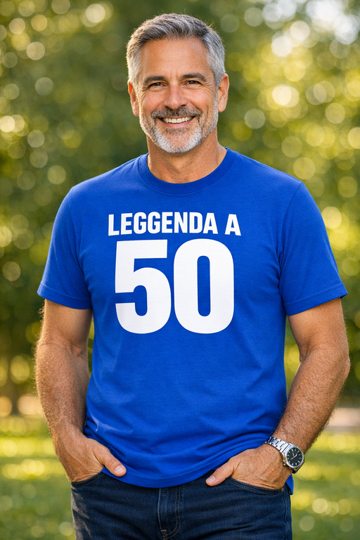 Quando compi 50 anni, meriti un messaggio chiaro: LEGGENDA A 50. È la t-shirt blu che accende sorrisi, battute e complimenti più in fretta delle candeline sulla torta.