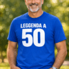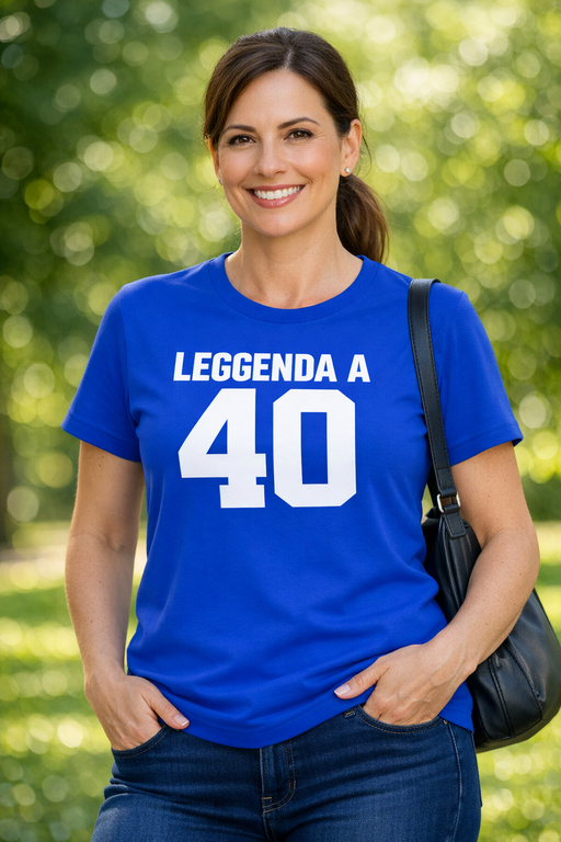 La scritta LEGGENDA A 40 dice tutto: un mix di ironia, orgoglio e vibes da festa, su una maglietta blu che si fa notare e sta bene con tutto.