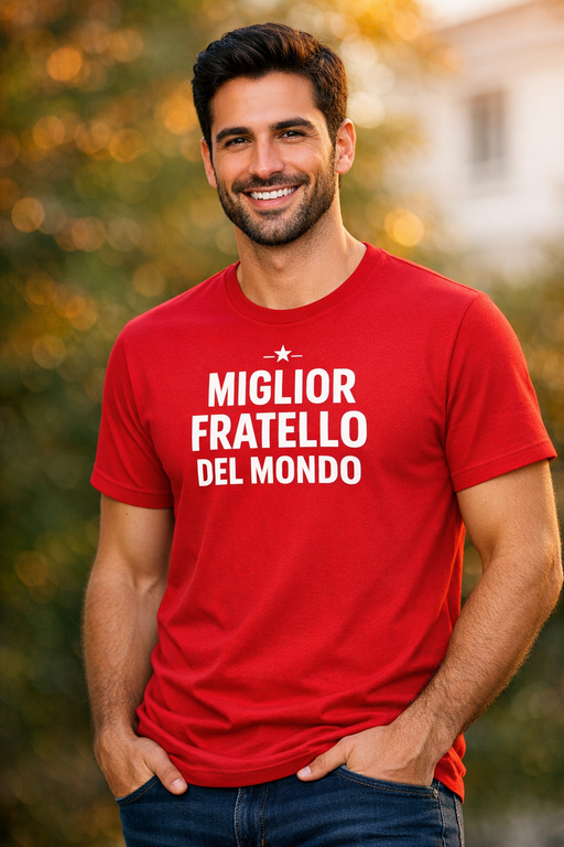 Rosso acceso, messaggio chiarissimo: MIGLIOR FRATELLO DEL MONDO. Perfetta per farlo sorridere (e far ingelosire tutti gli altri fratelli) in foto di famiglia, pranzi e sfottò tra fratelli.