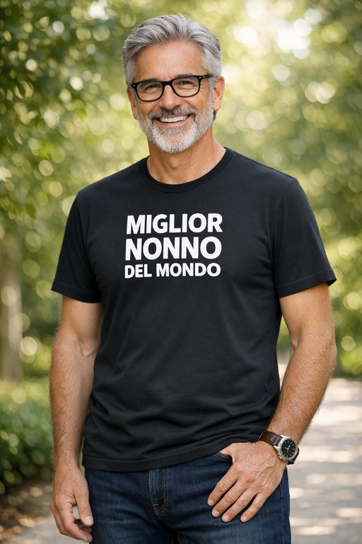 Una t-shirt nera con stampa bianca chiara e d’impatto: MIGLIOR NONNO DEL MONDO. È il modo più semplice (e più divertente) per celebrare il nonno che mette tutti d’accordo con carisma e cuore.