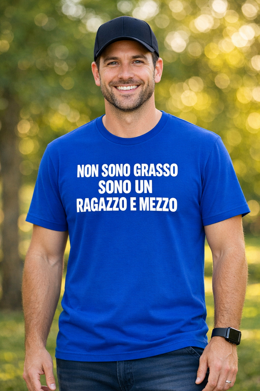 Una maglietta blu che dice la verita piu forte della bilancia. La scritta NON SONO GRASSO SONO UN RAGAZZO E MEZZO strappa risate e alza l’autostima. Perfetta per chi ama il buon cibo e l’ironia.