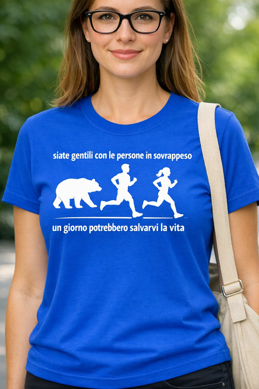 Una battuta fulminante che dice tutto in un attimo: “siate gentili con le persone in sovrappeso: un giorno potrebbero salvarvi la vita”. La grafica con l’orso e i runner rende il messaggio ancora più irresistibile, ideale per strappare risate ovunque.