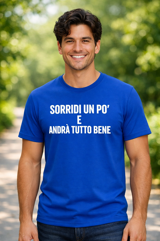 Una t-shirt blu dal mood positivo con stampa bianca e messaggio che parla da solo: SORRIDI UN PO’ E ANDRÀ TUTTO BENE. Perfetta per alleggerire l’atmosfera in ufficio, al bar o nei lunedì più tosti.