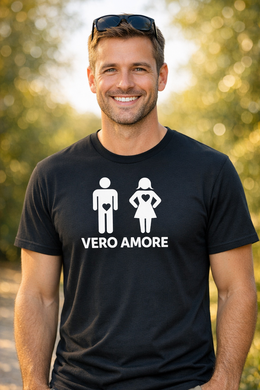 Minimal, ironica e super chiara: la grafica della coppia con i cuori “al posto giusto” e la scritta VERO AMORE fa sorridere e si fa notare, ovunque tu la indossi.