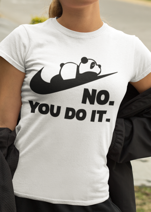 🐼 Quando qualcuno dice “lo fai tu?”, questo panda risponde: NO. YOU DO IT. La grafica della pandina che riposa sullo “swoosh” è perfetta per chi sa dire “no”… ma in modo adorabile.