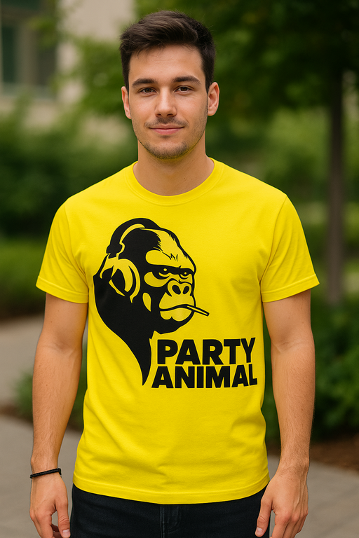 Gialla come una luce da disco, con gorilla in cuffie e stuzzicadenti: questa maglietta urla PARTY ANIMAL! 🦍🎧 Perfetta per festaioli, DJ e chi ha il venerdì nell’anima. 🎉