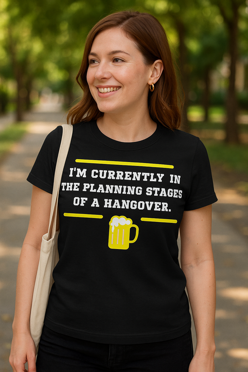 🍻 Piano: festa. Risultato: hangover. Questa maglietta lo dice al posto tuo! Maglietta nera a maniche corte con un boccale di birra schiumosa e lo slogan ‘I’M CURRENTLY IN THE PLANNING STAGES OF A HANGOVER’: l’uniforme ufficiale per il dopo-lavoro del venerdì o per weekend senza freni.