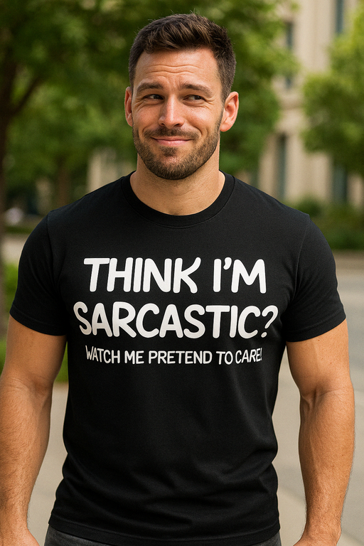 😜 Questa maglietta nera dice tutto: THINK I’M SARCASTIC? WATCH ME PRETEND TO CARE! Quando ti finisce la pazienza ma non l’umorismo, lascia parlare la stampa bianca su fondo nero. Un capo ideale per l’ufficio, l’aula o l’aperitivo del venerdì, quando la tua empatia è in pausa pranzo.