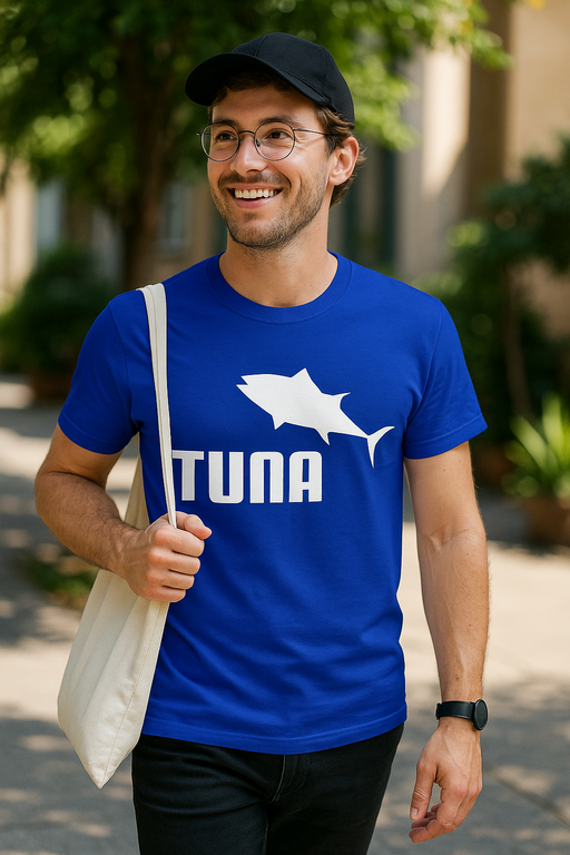 Silenzioso in acqua, rumorosissimo a terra. 🐟 Maglietta blu reale con tonno bianco e scritta TUNA: sei la cattura del giorno! Ideale per chi ama mare, sushi e battute. 😄