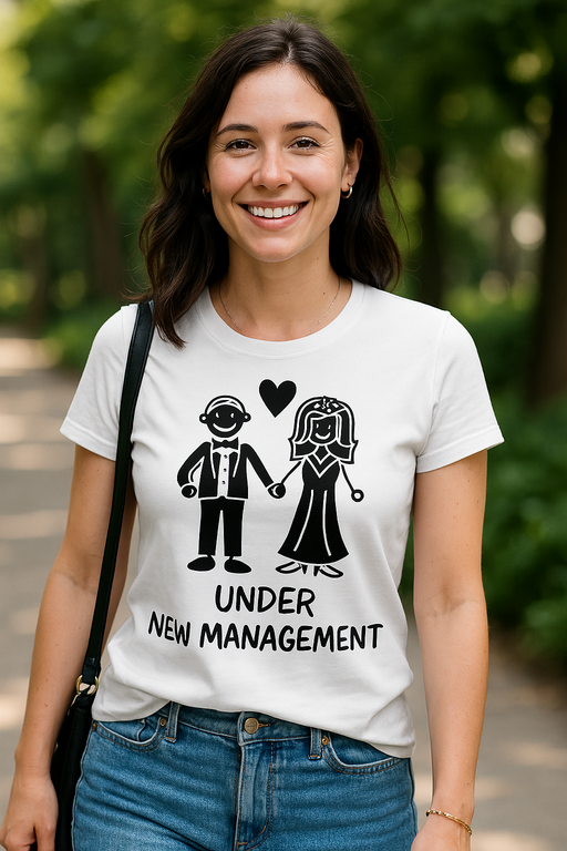 Quando l’amore passa alla nuova gestione, che lo sappia il mondo intero! 😄 Maglietta bianca con cartoon degli sposini e scritta UNDER NEW MANAGEMENT: dice più di mille promesse. Perfetta per novelli sposi, feste di fidanzamento e il team degli sposi! 💍