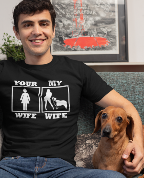 🐾😂 YOUR WIFE MY WIFE su maglietta nera: risata istantanea per tutti gli amanti dei cani! Due illustrazioni a quadretto dicono tutto: a sinistra la figurina “YOUR WIFE”, a destra la passeggiata col cane “MY WIFE”. Il contrasto è talmente spassoso che raccoglierai sorrisi ovunque — dal parco cani all’aperitivo del venerdì.