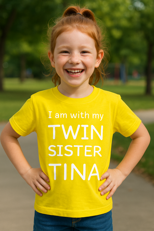 😎 Doppia dose di sorelle e stile: “I am with my TWIN SISTER TINA” su una maglietta giallo sole! Quando le gemelle sono in azione, serve ordine — e questa maglietta è un megafono portatile. Il giallo brillante e la scritta bianca dicono tutto, prima ancora che qualcuno faccia una domanda. Meno confusione, più “ooo” e “aaa” e tante prove fotografiche per l’album di famiglia.