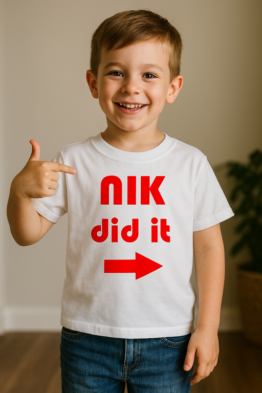 😅 Quando in casa si sente ‘Chi l’ha fatto?’, la maglietta risponde: Nome did it! Questa maglietta bianca a maniche corte per bambini, con scritta rossa e freccia rossa sul davanti, è un vero pezzo di prova comica. Quando il piccolo curioso ‘per sbaglio’ sposta il vaso, la freccia indica gentilmente la direzione giusta. Il motto trasforma ogni ‘ops’ in risate e in foto strepitose per l’album di famiglia.