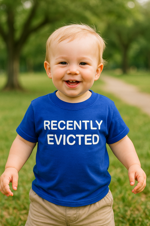 🤣 Fine dell’affitto nel pancione! La maglietta blu con la scritta bianca RECENTLY EVICTED dice tutto al posto tuo.