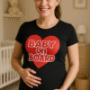 Mini annuncio con grandi risate! 👶 Maglietta premaman rosa con scritta BABY INSIDE e piedini: dice tutto senza ecografia. Perfetta per future mamme, annunci e foto spassose! 📸